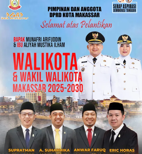 KABARBAIK.NEWS – Pimpinan Dewan Perwakilan Rakyat Daerah (DPRD) Kota Makassar mengucapkan selamat dan sukses kepada Munafri Arifuddin yang baru dilantik sebagai Walikota Makassar, serta Aliyah Mustika Ilham yang menjabat sebagai Wakil Walikota Makassar.